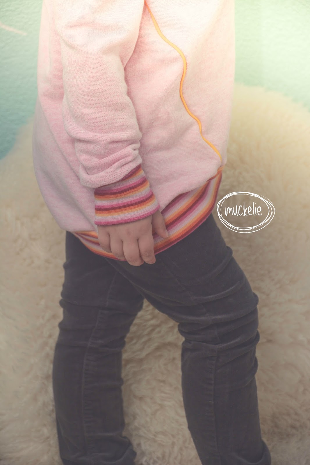 Ich liebe ja diese Bündchen. Das Rose-Pink-Rot-Orange-Gelb sieht einfach klasse aus, aber zum annähen ist es es schlimm. Ich mag es nämlich gar nicht, wenn man mit gestreiften Bündchen arbeite schräg angenäht wird.